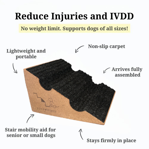 Stairwedge is designed to reduce the risk of injuries, including IVDD (Intervertebral Disc Disease), by making stair climbing safer and easier on your pet's joints and spine. Give your pet a safer way to get around and help them stay active and healthy for years to come.
